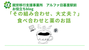 「食べ合わせ」ってなに? こんにちは、就労移行支援事業所 アルファ日暮里駅前のblog担当です。 今日は「食...